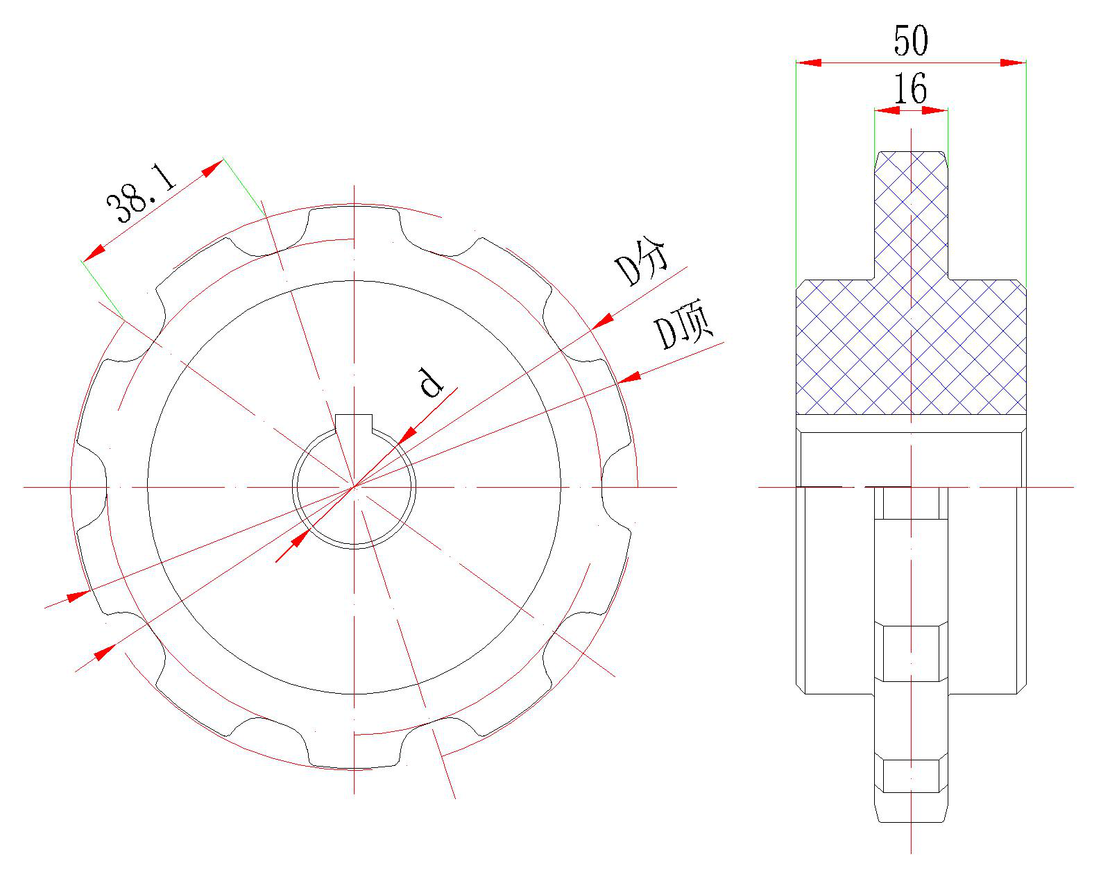| 鏈輪型號(hào) | 齒數(shù) | D分(mm) | D頂(mm) | d孔徑(mm) |