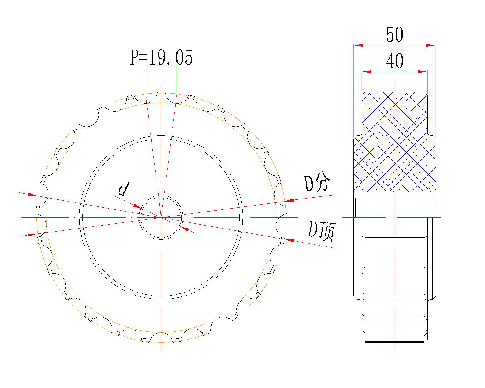 | 鏈輪型號 | 齒數(shù) | D分(mm) | D頂(mm) | d孔徑(mm) |
